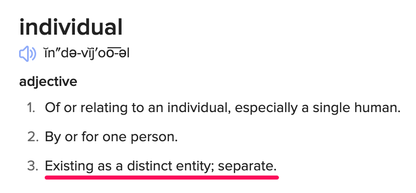 Whereas our conventional use of the word is predicated on a sense of separation. It is oriented towards defining what makes us distinct from the collective. In that frame, when we think of ourselves as an individual, we are seeking to find what makes us unique. Searching for what makes us different from "others" around us.